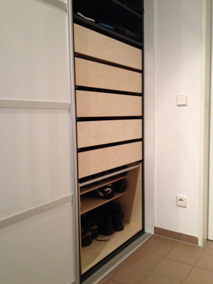 Kleiderschrank mit Schiebetüren und glänzenden Füllungen; Rahmen Aluminium eloxiert.