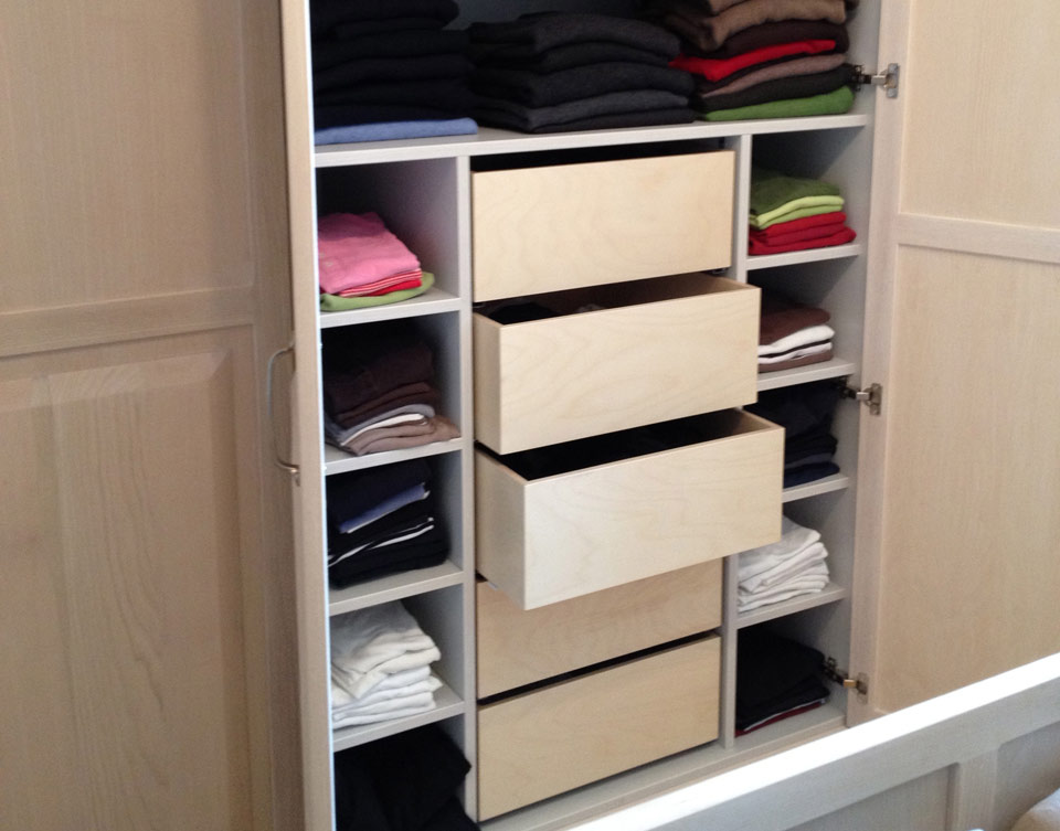 Die kompletten Schlafzimmerfronten sowie das Bett und die Sitzkommode bestehen aus massiver Esche, klassisch, traditionell und zeitlos.